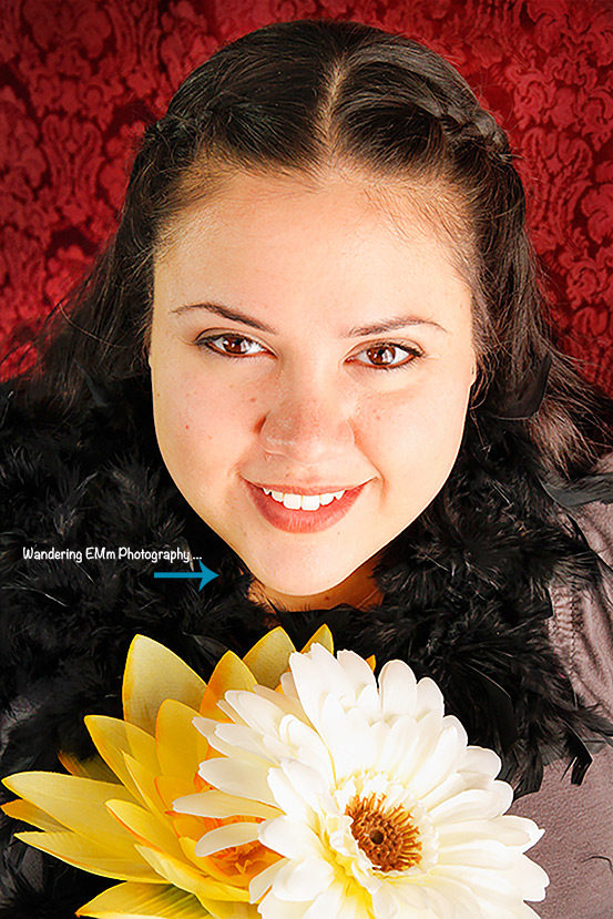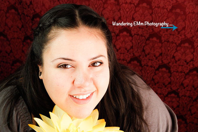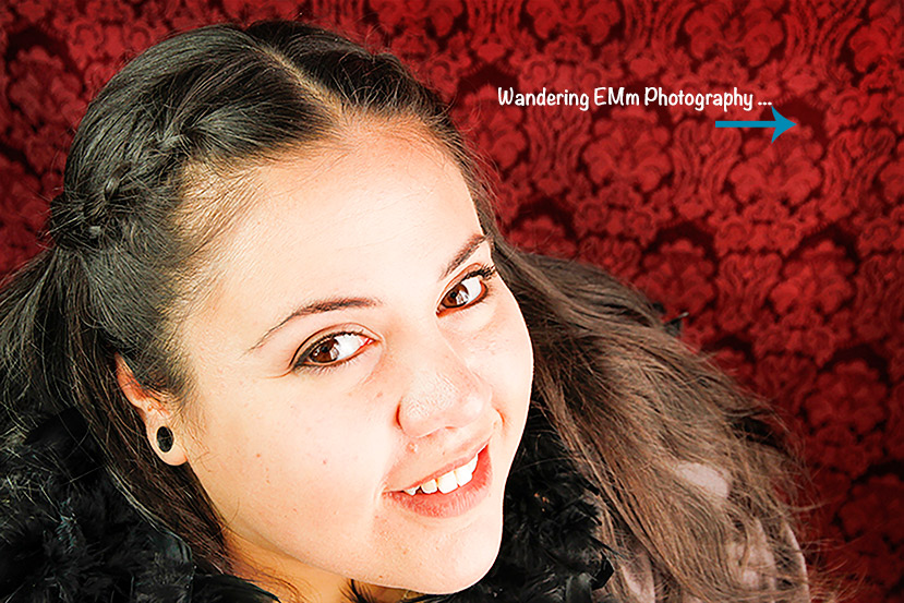 By adding a couple of flowers and a boa, we had fun creating engaging portraits in my living room. Dollerama is a great resource for inexpensive add-on’s, or props, to use in your photo-shoot. You can also improvise with scarfs, and other small accessories, to create a different mood or aid in a specific facial expression. Also, using a tablecloth, instead of a traditional black or white backdrop, adds some colour and texture to the final look of these photos. The table cloth was hung over my T.V. cabinet, and Trina sat on a low stool so there was enough room above Trina’s head; plus adding space for cropping purposes. The contrast between Trina’s dark hair, striking features, and the red of the tablecloth, adds to the femininity; and some interest, to all corners of the photograph. Using window light and a Westcott Home Lighting Kit from Henry’s, Trina’s features come to life. (http://www.fjwestcott.com/erin-manning-home-studio-lighting-kit)